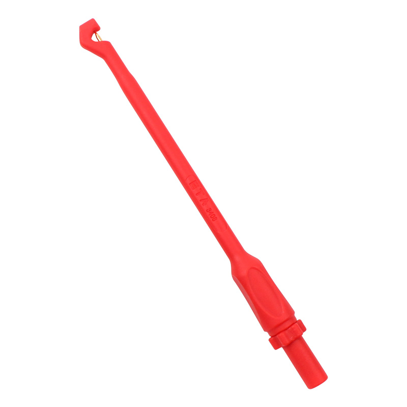 在某些情況下無法無法找到被測點(diǎn)而必須破開電線外皮對信號測試時(shí),可以方便地使用這個(gè)工具,ETA3408全絕緣快速穿孔測試夾可穿透0.25至1.5毫米絕緣電線,獨(dú)特的V型線槽設(shè)計(jì),確保測針的位置保持在電纜中間,尾部4mm插座可與萬用表或示波器的測試引線一起使用,簡單,安全,高效。使用方法就將4mm測試線纜插入穿刺測針的末端,測試電纜放入V型線槽中,松開按鈕,測試工具內(nèi)的一個(gè)非常精細(xì)的探頭可以刺穿電纜護(hù)套和內(nèi)導(dǎo)體直接接觸,從而在電纜內(nèi)部進(jìn)行信號快速無損檢測,測試后,松開按鈕,拆下電線,電纜護(hù)套留下針孔可實(shí)現(xiàn)絕緣自愈。