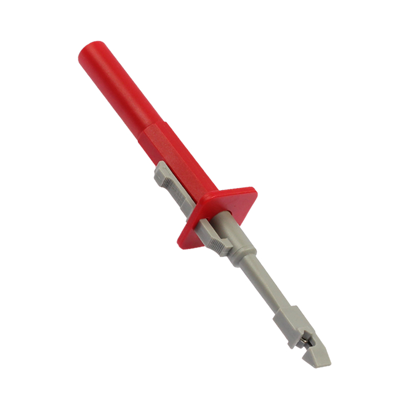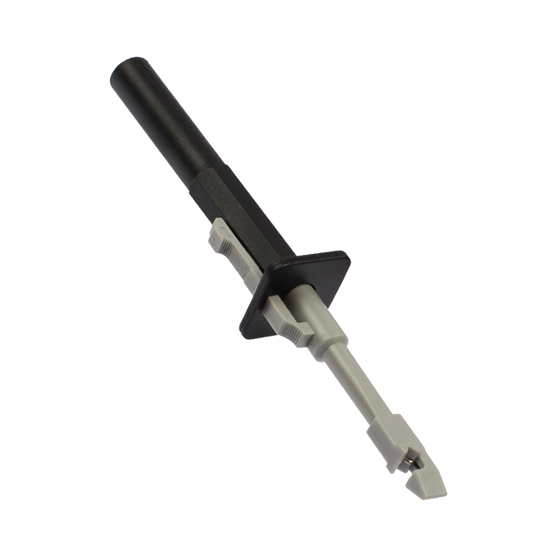 在某些情況下無法無法找到被測點(diǎn)而必須破開電線外皮對信號測試時(shí),可以方便地使用這個(gè)工具,ETA3404獨(dú)特的V型線槽設(shè)計(jì),確保測針的位置保持在電纜中間,尾部4mm插座可與萬用表或示波器的測試引線一起使用,簡單,安全,快捷。使用方法就將4mm測試線纜插入穿刺測針的末端,測試電纜放入V型線槽中,釋放按鈕并測試,此時(shí)尖銳的測針可以直接刺穿電纜護(hù)套到導(dǎo)體,從而對電纜信號進(jìn)行無損檢測,測試后,松開按鈕拆下電線,電纜護(hù)套留下針孔很容易密封,優(yōu)質(zhì)絕緣層可實(shí)現(xiàn)絕緣自愈。