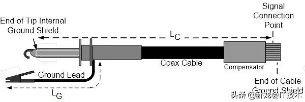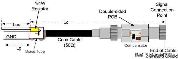 圖2:基于同軸電纜的1:1屏蔽式電壓探頭。探頭上的電感(LUS)和地線(LG)會限制帶寬,但由于尺寸小,有助于減少噪聲拾取。