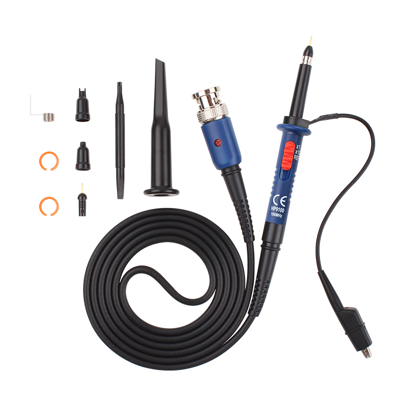 100MHz示波器高頻探頭 - 采用可跟換的低電阻鍍金測(cè)針,卡扣式旋轉(zhuǎn)接地導(dǎo)線,允許用戶在1X,10X和REF(參考地)之間快速手動(dòng)切換。探頭主體由高強(qiáng)度塑料制成,在所有彎折受力處采用軟塑料保證電纜的使用壽命。