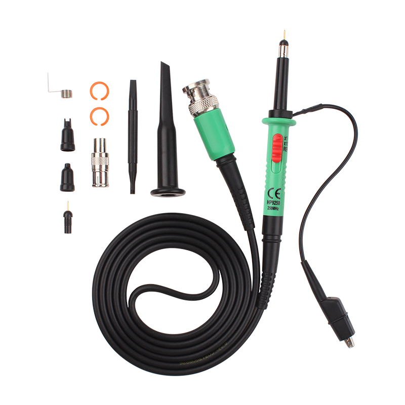250MHz示波器高頻探頭 - 采用可跟換的低電阻鍍金測針,卡扣式旋轉(zhuǎn)接地導線,允許用戶在1X,10X和REF(參考地)之間快速手動切換。探頭主體由高強度塑料制成,在所有彎折受力處采用軟塑料保證電纜的使用壽命。